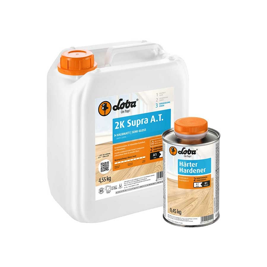 Loba 2K Supra: Ceramic technology adds a new level of scratch resistance. The government-funded collaboration with a renowned R&D centre resulted in the development of the aqueous, two-component pure polyurethane finish 2K Supra A.T. It gives a degree of scratch resistance that no aqueous finish has ever attained. The use of 2K Supra A.T. is equally as simple and practical as that of its tried-and-true forerunner product.